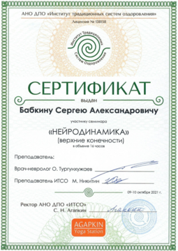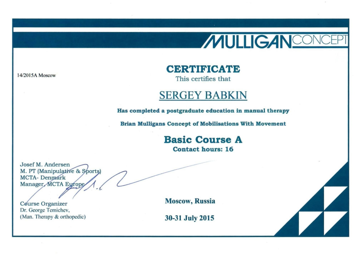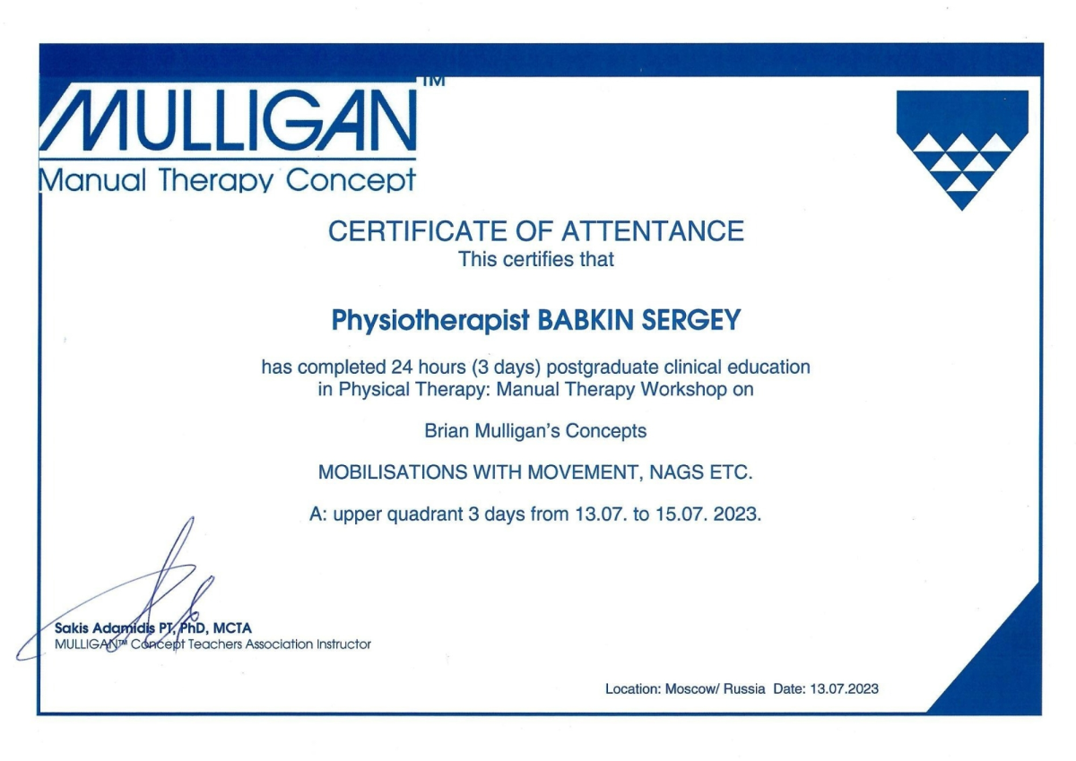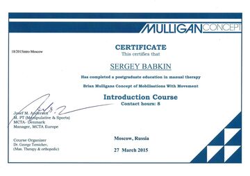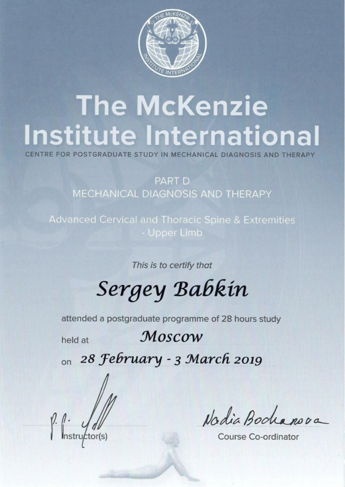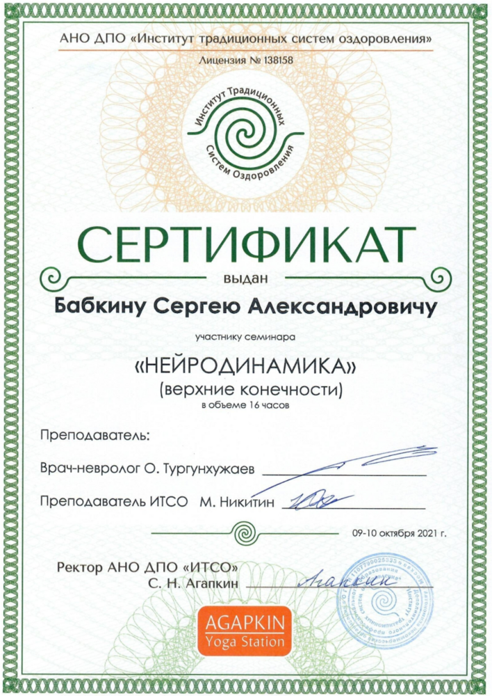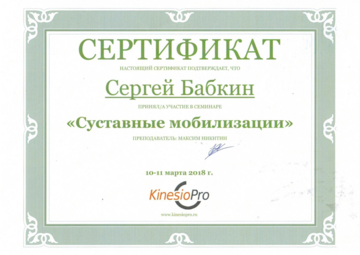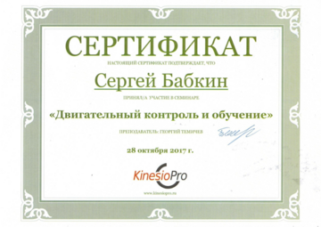 Сергей Александрович Бабкин — специалист с многолетним опытом в области физической реабилитации, функционального тренинга и йогатерапии. Его профессиональная карьера началась в 2004 году с йогатерапии, а с 2007 года он занимается физической реабилитацией. За это время он помог многим пациентам восстановиться после травм, составить эффективные программы реабилитации и улучшить осанку.