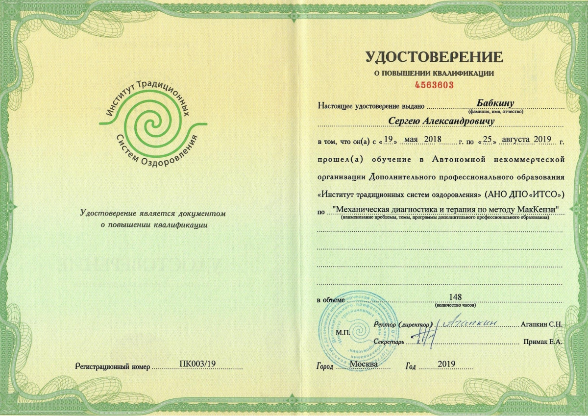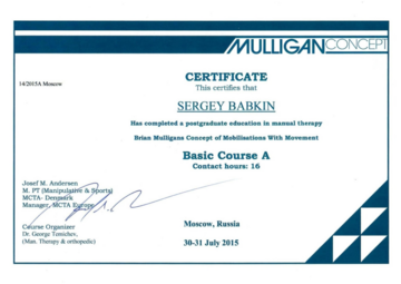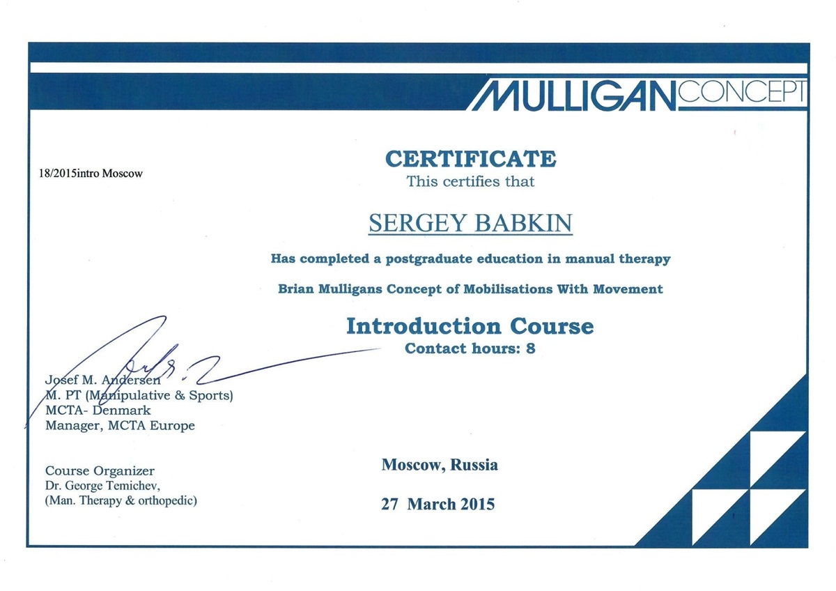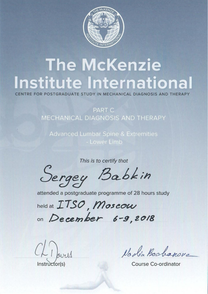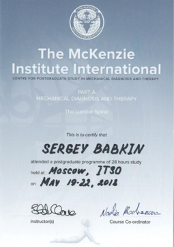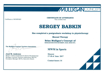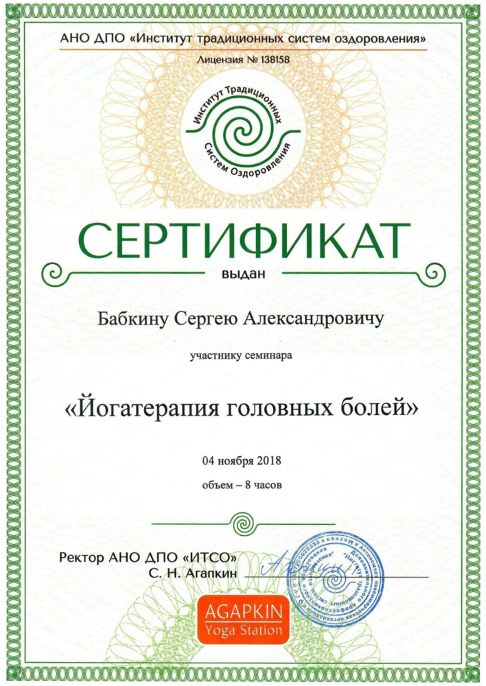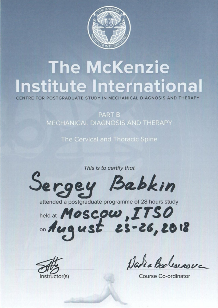 Сергей Александрович Бабкин — специалист с многолетним опытом в области физической реабилитации, функционального тренинга и йогатерапии. Его профессиональная карьера началась в 2004 году с йогатерапии, а с 2007 года он занимается физической реабилитацией. За это время он помог многим пациентам восстановиться после травм, составить эффективные программы реабилитации и улучшить осанку.